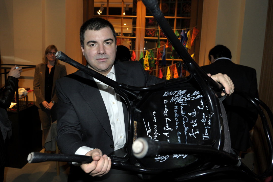 1 (of 20) Like many Nobel Laureates before him, Konstantin Novoselov autographs a chair at Kafé Satir at the Nobel Museum in Stockholm, 6 December 2010.Copyright © Scanpix 2010 Photo: Janerik Henriksson/Scanpix