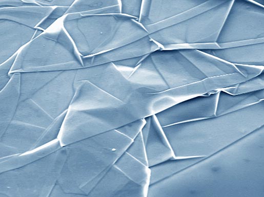 18 (of 20) Graphene nanofabric. Scanning electron micrograph of a strongly crumpled graphene sheet on a Si wafer. Note that it looks just like silk thrown over a surface. Lateral size of the image is 20 microns. Si wafer is at the bottom-right corner.