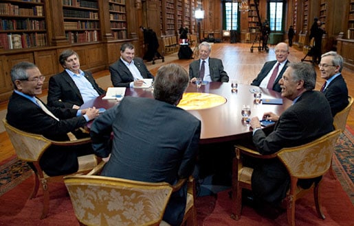 7 (of 20) Taping of the TV-programme Nobel Minds in the Bernadotte Library at the Royal Palace in Stockholm, 9 December 2010. From left: Nobel Laureate in Chemistry Ei-ichi Negishi, Nobel Laureates in Physics Andre Geim and Konstantin Novoselov, Nobel Laureate in Literature Mario Vargas Llosa, Laureates in Economic Sciences Dale T. Mortensen, Christopher A. Pissarides and Peter A. Diamond. The programme was led by Matt Frei from BBC World News.
