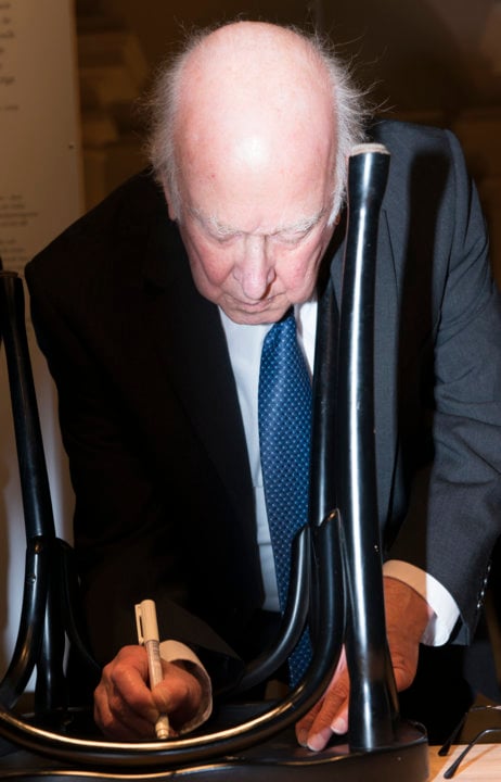 Like many Nobel Laureates before him, Peter Higgs autographs a chair at Bistro Nobel at the Nobel Museum in Stockholm, 6 December 2013.