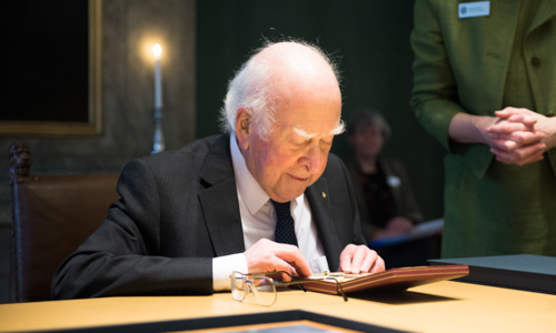 Peter Higgs visits the Nobel Foundation on 11 December 2013 and signs the guest book. On this occasion, the Laureates retrieve the Nobel diploma and Medal, which have been displayed in the Golden Hall of the City Hall following the Nobel Prize Award Ceremony. The Laureates also discuss the details concerning the transfer of their prize money.