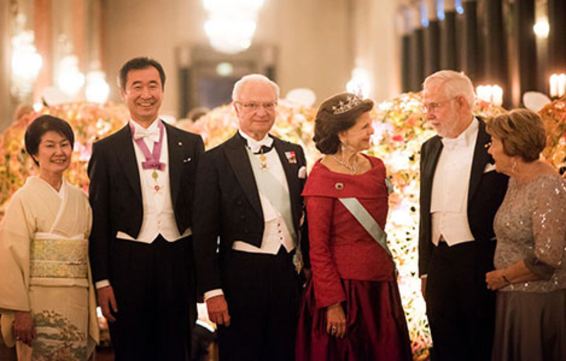 Nobel Laureates at the Nobel Prize Award Ceremony. From left: Physics Laureates Takaaki Kajita and Arthur B. McDonald, Chemistry Laureates Tomas Lindahl, Paul Modrich and Aziz Sancar, Medicine Laureates William C. Campbell, Satoshi Ōmura and Tu Youyou, Literature Laureate Svetlana Alexievich and Laureate in Economic Sciences Angus Deaton.