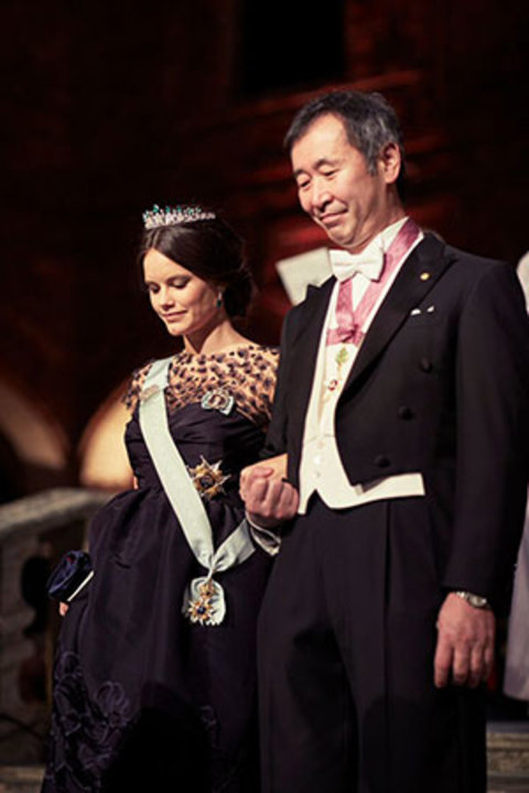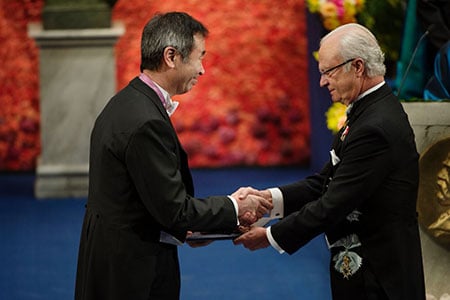 Takaaki Kajita receiving his Nobel Prize from H.M. King Carl XVI Gustaf of Sweden at the Stockholm Concert Hall, 10 December 2015.