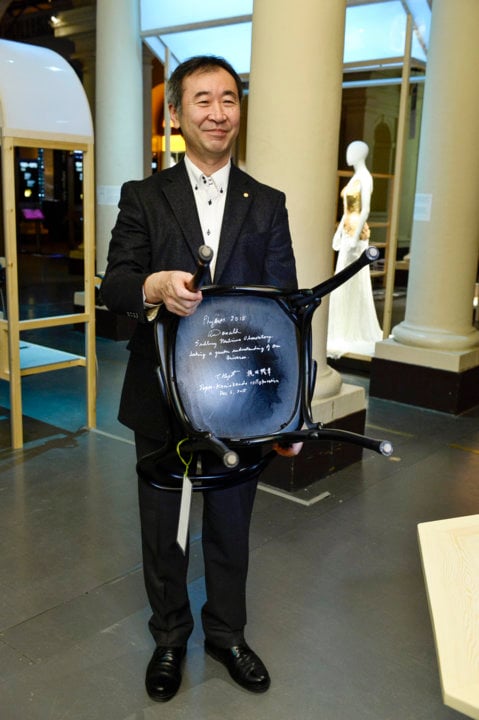 11 (of 13) Nobel Laureate Takaaki Kajita and the autographed chair at the Nobel Museum in Stockholm.