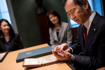Takaaki Kajita takes a closer look at his Nobel Medal and Diploma during his visit to the Nobel Foundation on 12 December 2015. On this occasion, the Laureates retrieve the Nobel diploma and Medal, which have been displayed in the Golden Hall of the City Hall following the Nobel Prize Award Ceremony. The Laureates also discuss the details concerning the transfer of their prize money.