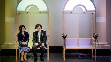 12 (of 13) Takaaki Kajita and his wife, Mrs Michiko Kajita, explores exhibition Nobel Creations at the Nobel Museum in Stockholm, 6 December 2015.