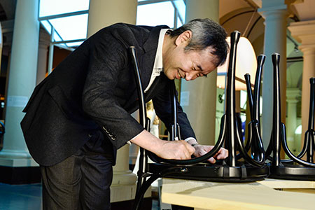 10 (of 13) Like many Nobel Laureates before him, Takaaki Kajita autographs a chair at Bistro Nobel at the Nobel Museum in Stockholm, 6 December 2015.