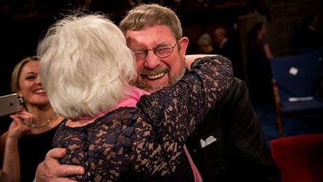 Mrs Berit Kosterlitz gives her husband a hug after the Nobel Prize Award Ceremony.