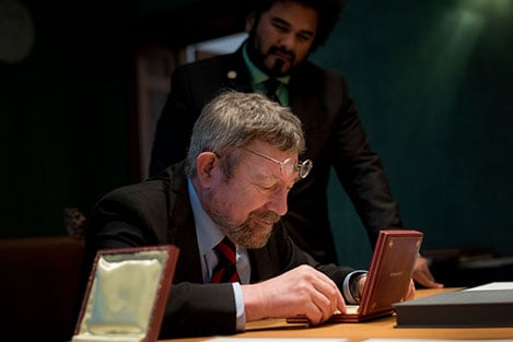 J. Michael Kosterlitz takes a closer look at his Nobel Medal during his visit to the Nobel Foundation on 12 December 2016. On this occasion, the Laureates retrieve the Nobel diploma and Medal, which have been displayed in the Golden Hall of the City Hall following the Nobel Prize Award Ceremony. The Laureates also discuss the details concerning the transfer of their prize money.