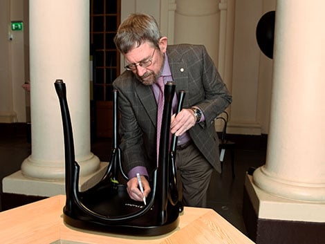 10 (of 13) Like many Nobel Laureates before him, J. Michael Kosterlitz autographs a chair at the Nobel Museum in Stockholm, 6 December 2016.