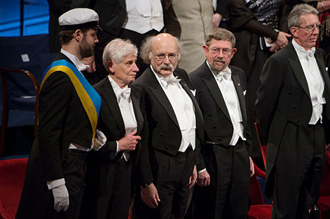 All thre Physics Laureates at the stage. From left: David J. Thouless, F. Duncan M. Haldane and J. Michael Kosterlitz. Far right: Chemistry Laureate Jean-Pierre Sauvage.