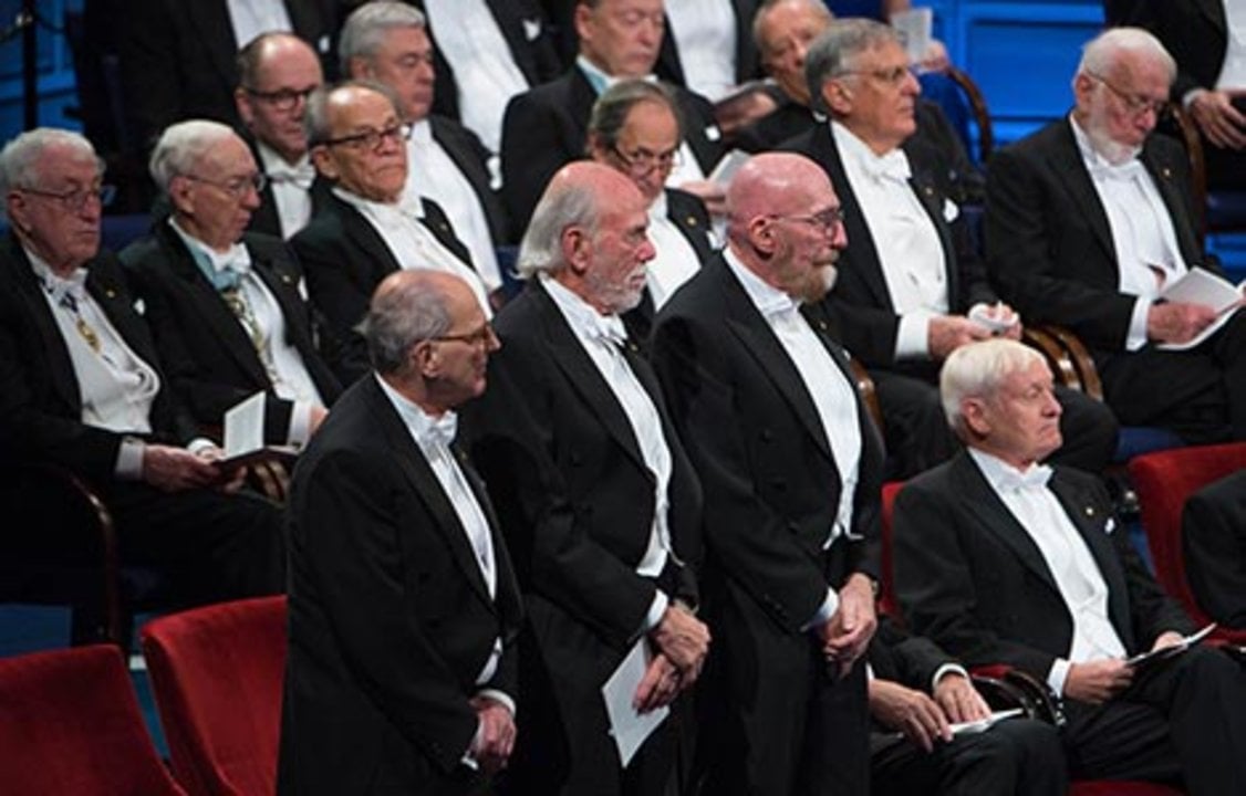 7 (of 11) 2017 laureates assembled at the Nobel Foundation during Nobel Week on 12 December 2017. Back row: chemistry laureate Jacques Dubochet, physics laureate Barry C. Barish medicine laureates Michael W. Young and Michael Rosbash, physics laureate Kip S. Thorne and chemistry laureate Joachim Frank. Front row: medicine laureate Jeffrey C. Hall, representatives of peace laureate ICAN Beatrice Fihn and Josefin Lind, Richard H. Thaler, chemistry laureate Richard Henderson and physics laureate Rainer Weiss.
