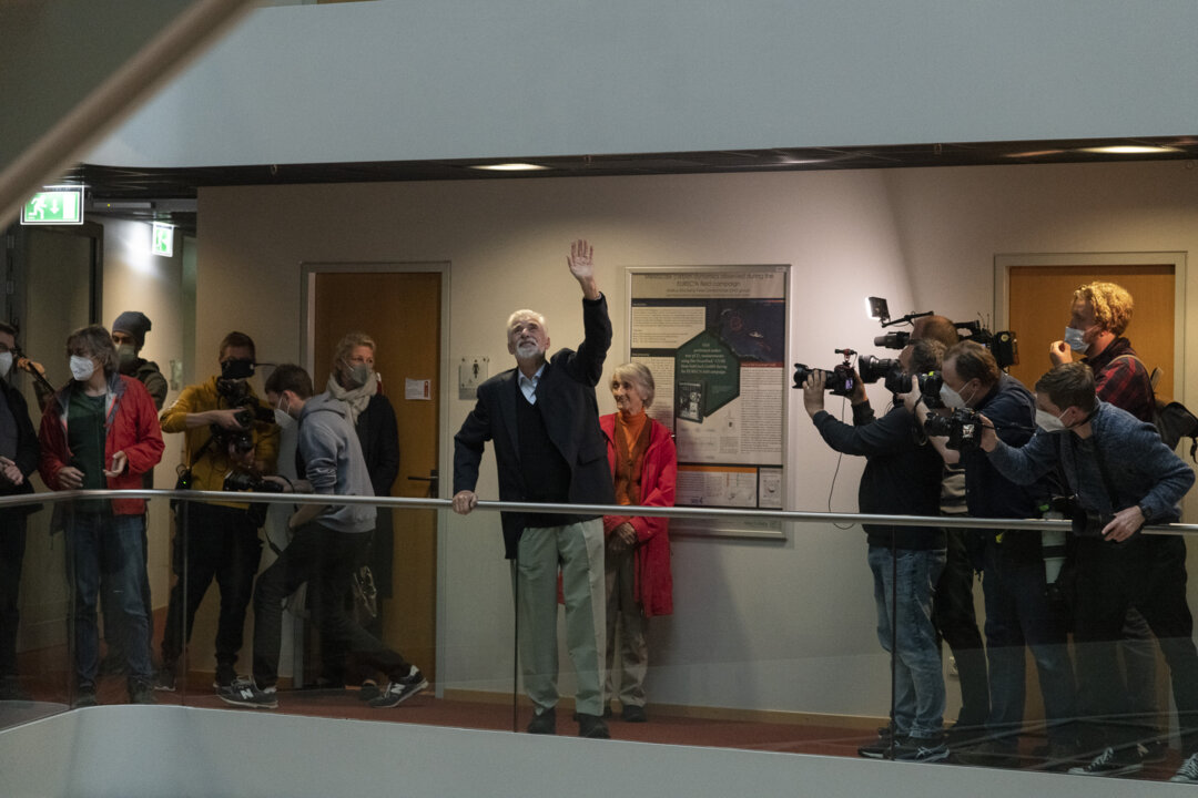 4 (of 5) Klaus Hasselmann waving to the crowd cheering for him, employees from the Max Planck Institute for Meteorology, German Climate Computing Center and University of Hamburg, on the day of the announcement of the Nobel Prize in Physics, 5 October 2021.