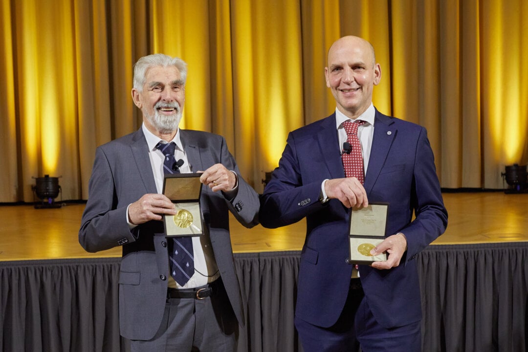 3 (of 5) Physics laureate Klaus Hasselmann and chemistry laureate Benjamin List showing their Nobel Prize medals after a ceremony Berlin, Germany, on 7 December.