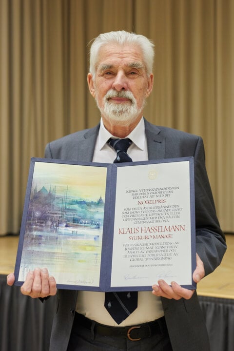 2 (of 5) Klaus Hasselmann showing his Nobel Prize diploma.