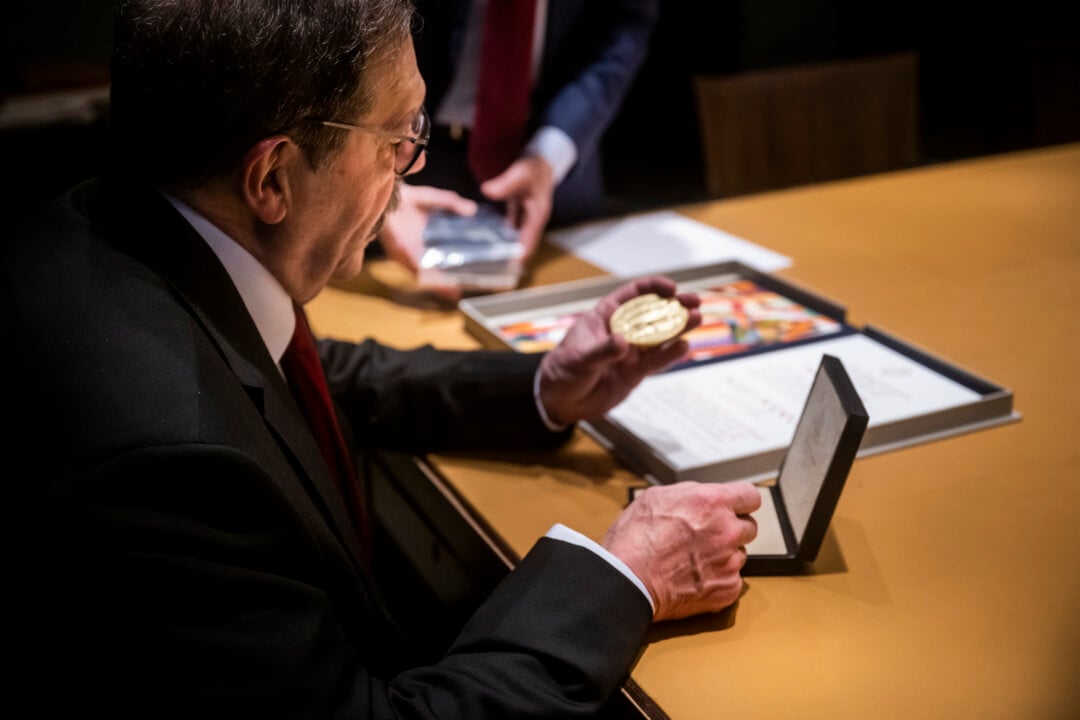 9 (of 18) Physics laureate Alain Aspect takes a closer look at his Nobel Prize medal and diploma during his visit to the Nobel Foundation on 11 December 2022.