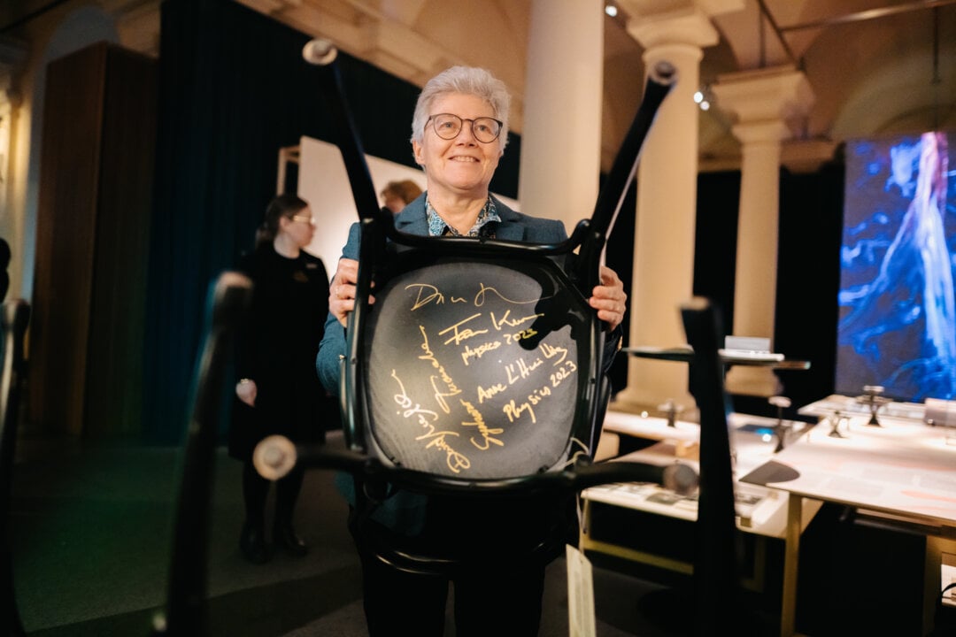 9 (of 13) Like many laureates before her, Anne L’Huillier signed a chair at the laureates' Get together at the Nobel Prize Museum in Stockholm on 6 December 2023.