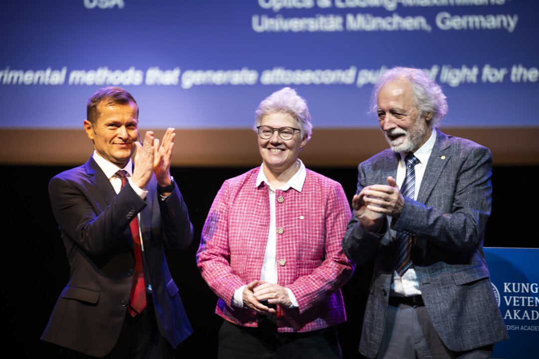 8 (of 13) The three 2023 physics laureates after delivering their Nobel Prize lectures on 8 December 2023 at the Aula Magna, Stockholm University. From left: Ferenc Krausz, Anne L’Huillier and Pierre Agostini.