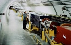 | Inside the 6.9 km long tunnel of the CERN 450 GeV super proton synchrotron. The blue magnets focus, and the red magnets bend the particles. Photo: Cern |