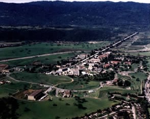 | The Stanford Linear Collider (SLC). Electrons were accelerated in the 3 km long linear accelerator together with positrons. After having reached their final energy, the positrons and electrons were separated magnetically and transported along two big arcs at the ends of which they met head-on in a single collision point. The positrons were produced by a fraction of the accelerated electrons which when being stopped in a target generate abundant number of positrons, electrons and photons. The positrons were collected and returned to the upstream end of the linear accelerator where they were formed into a dense beam by damping rings. Subsequently they were accelerated together with the beam of electrons. Illustration: Stanford Linear Accelerator Center |