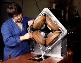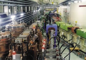 | The largest synchrocyclotron still in use is located in Gatchina outside St Petersburg and it accelerates protons to a kinetic energy of 1,000 MeV. The iron poles are 6 meters in diameter and the whole accelerator weighs 10,000 tons, a weight comparable to that of the Eiffel Tower. The energies attained correspond to that of a proton accelerated in a potential drop of one billion volts. It is used for nuclear physics experiments and medical applications. Photo: Gatchina Nuclear Physics Institute |