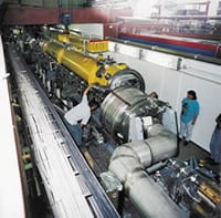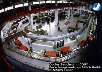 View of the Cooler Synchrotron COSY in Jülich during the installation phase in 1992. Orange dipole magnets for bending and yellow quadrupole magnets for focusing are the essential components of the ring. In this ring, stochastic cooling as well as electron cooling is used to improve the quality of the circulating beam.