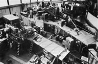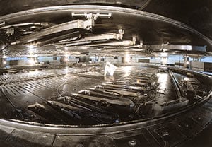 | Fermilab was the first laboratory to introduce superconducting technology at a big scale. The ring on the floor consists of magnets with superconducting wire coils and was placed under the existing proton synchrotron that was dismantled in 1997. The superconducting wire coils provide magnetic fields up to 5 tesla. In this lower ring, protons and antiprotons, rotating clockwise and counter-clockwise respectively, are accelerated to 1 TeV equivalent to 1 million MeV (1 TeV = 1 Tera electron Volt). This accelerator, the Tevatron, is the first of a new generation of synchrotrons using superconducting technology, which will eventually permit acceleration of particles up to energies of many TeV. Photo: Fermilab |