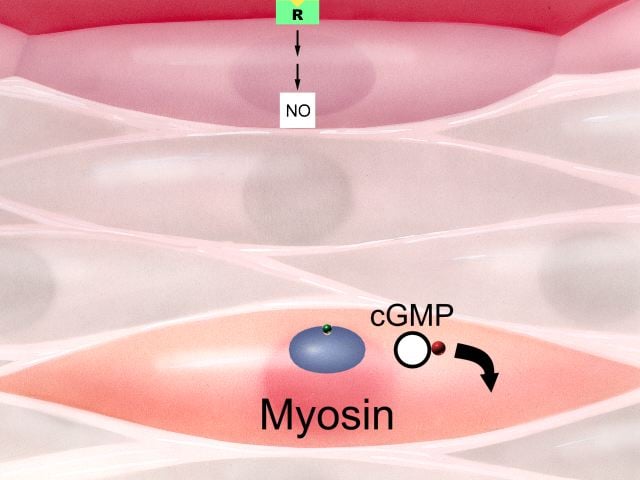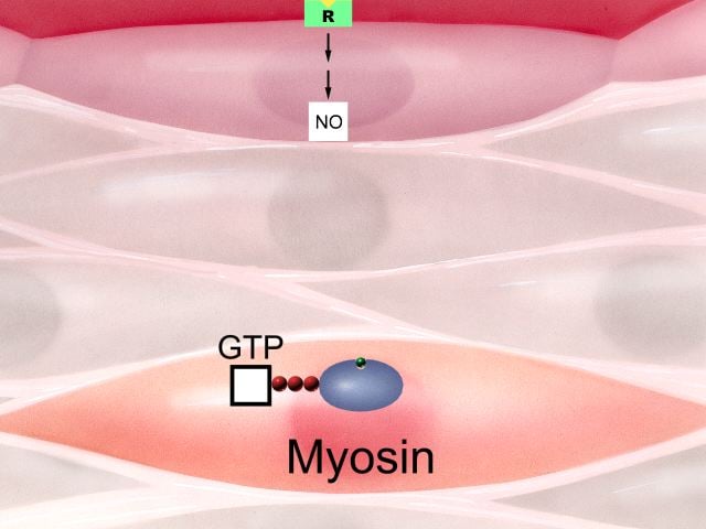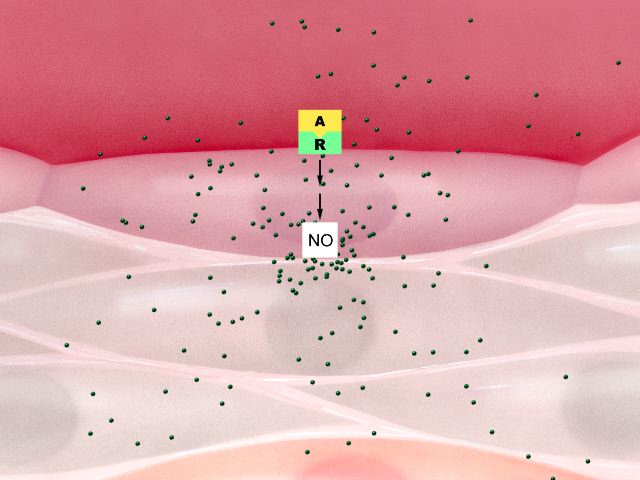 – When NO is produced by the innermost cell layer of the arteries, the endothelium, it rapidly spreads through the cell membranes to the underlying muscle cells. Their contraction is turned off by NO, resulting in a dilatation of the arteries. In this way, NO controls the blood pressure and its distribution. It also prevents the formation of thrombi.