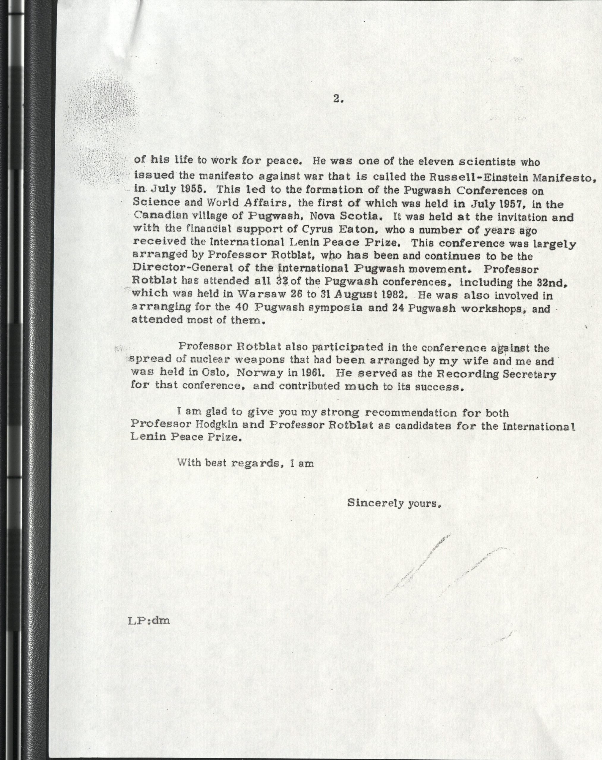 1 (of 2) A letter from chemist and peace activist Linus Pauling recommending Dorothy Crowfoot Hodgkin for the Lenin Peace Prize, 7 January 1983.