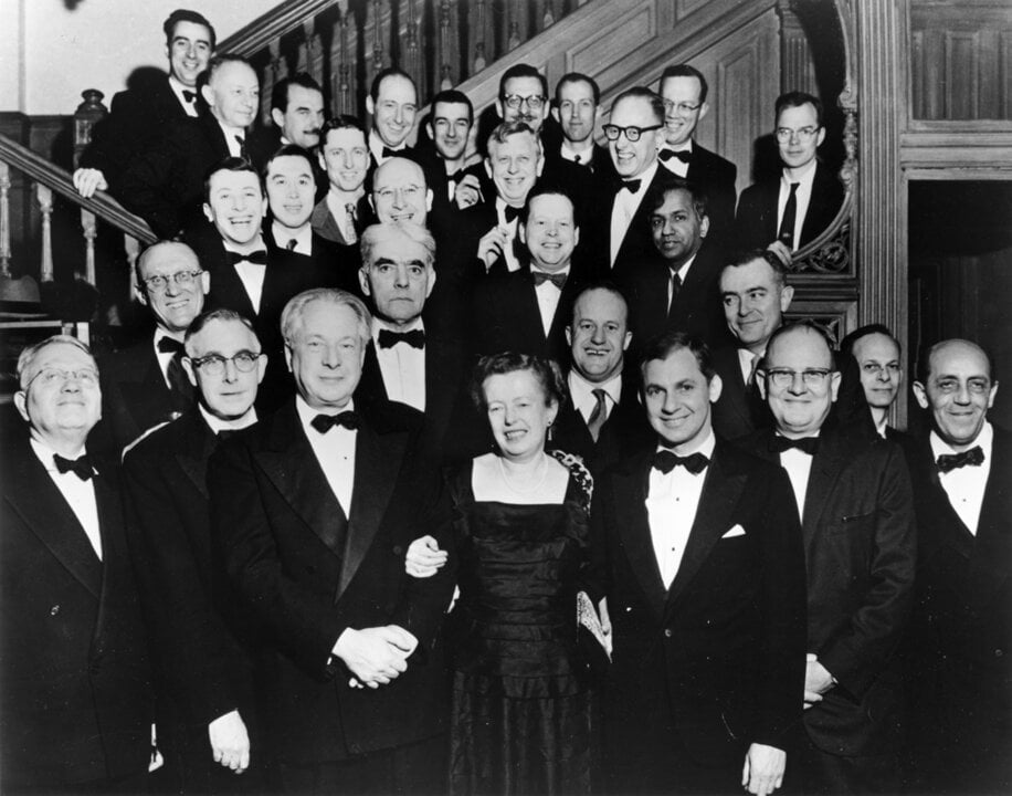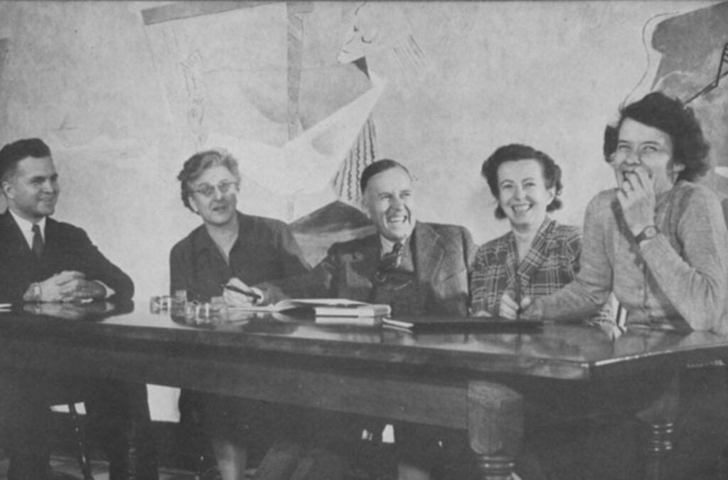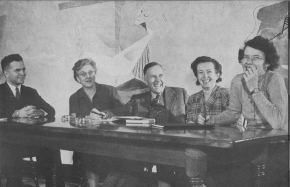 1 (of 2) Maria Goeppert Mayer (second from right) with faculty in the dining hall, 1943 Sarah Lawrence College Yearbook. Sarah Lawrence was the first institution to give Goeppert Mayer a salaried position.