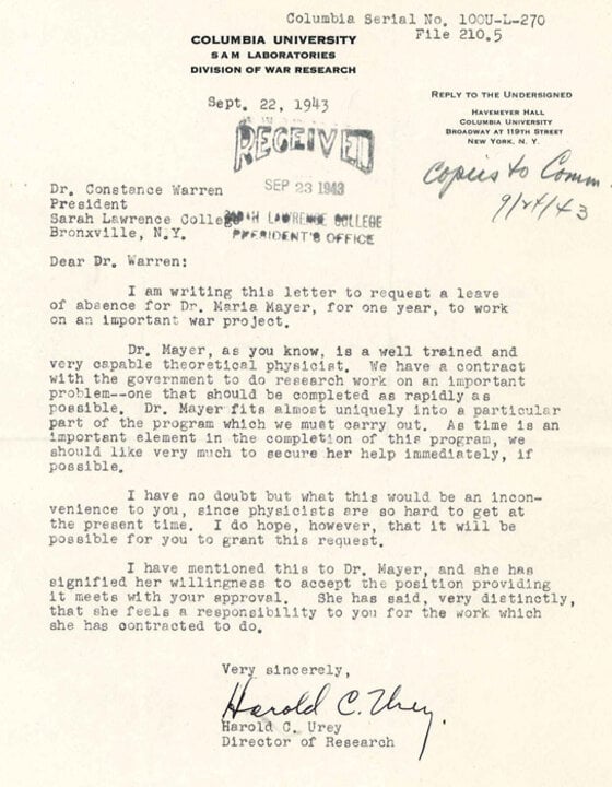 2 (of 2) A letter requesting that Maria Goeppert Mayer be relieved of her duties to help with an important project for national security: the Manhattan Project.